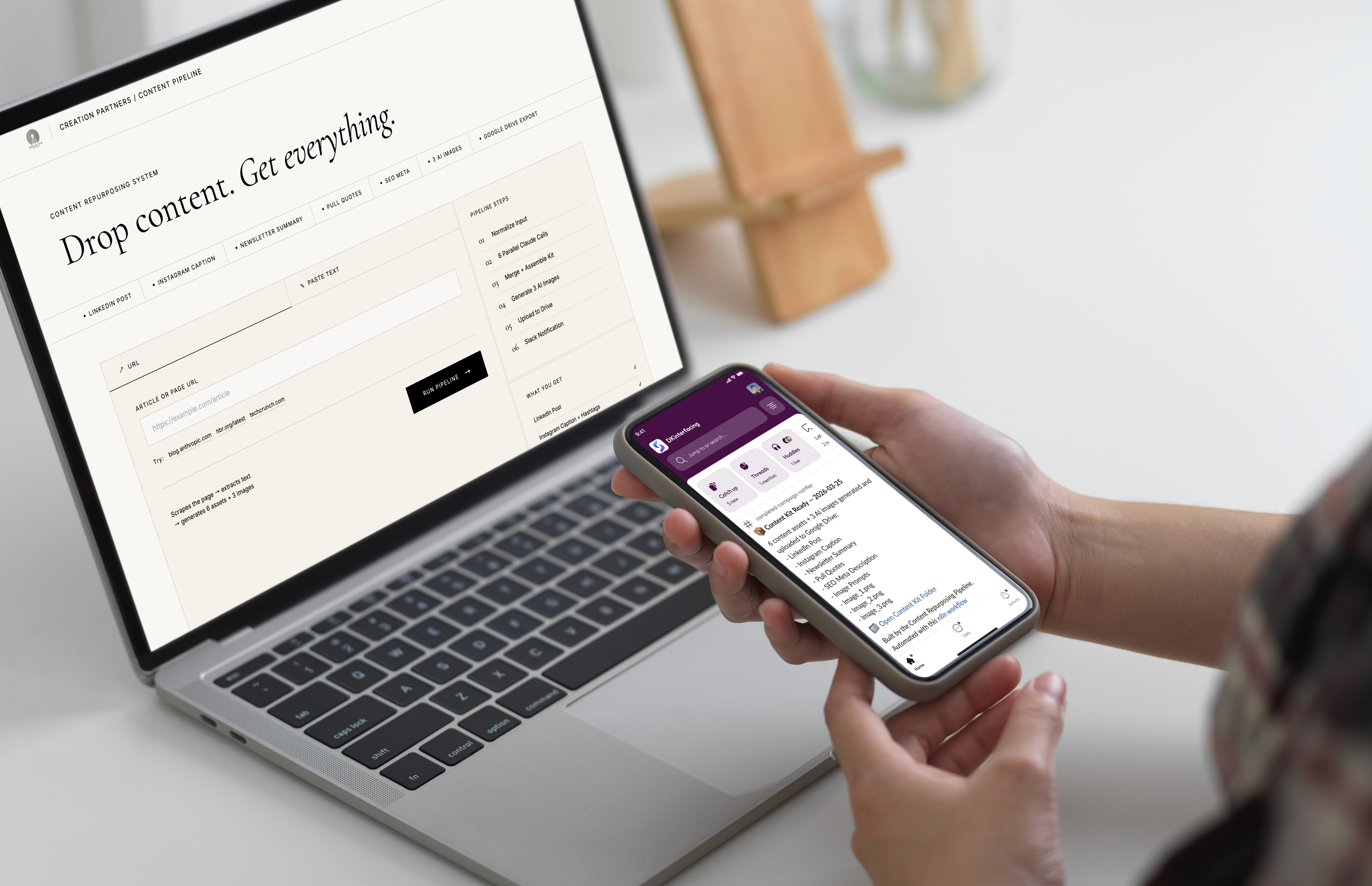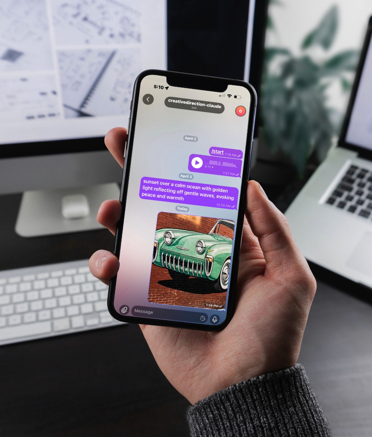 Studio Bubull needed creative ideas to move at the speed of inspiration, not the speed of a production schedule. A designer spots something on the street, hears a sound, or has an idea in the shower. By the time they are back at a desk, the feeling is gone. This system closes that gap entirely. A photo, a voice memo, or a quick text sent to Telegram is all it takes. Within seconds, a fully structured creative direction package is waiting in Google Drive: brief, brand guide, and mood board images ready to present, share, or build from. Inspiration captured, interpreted, and packaged before the moment passes.