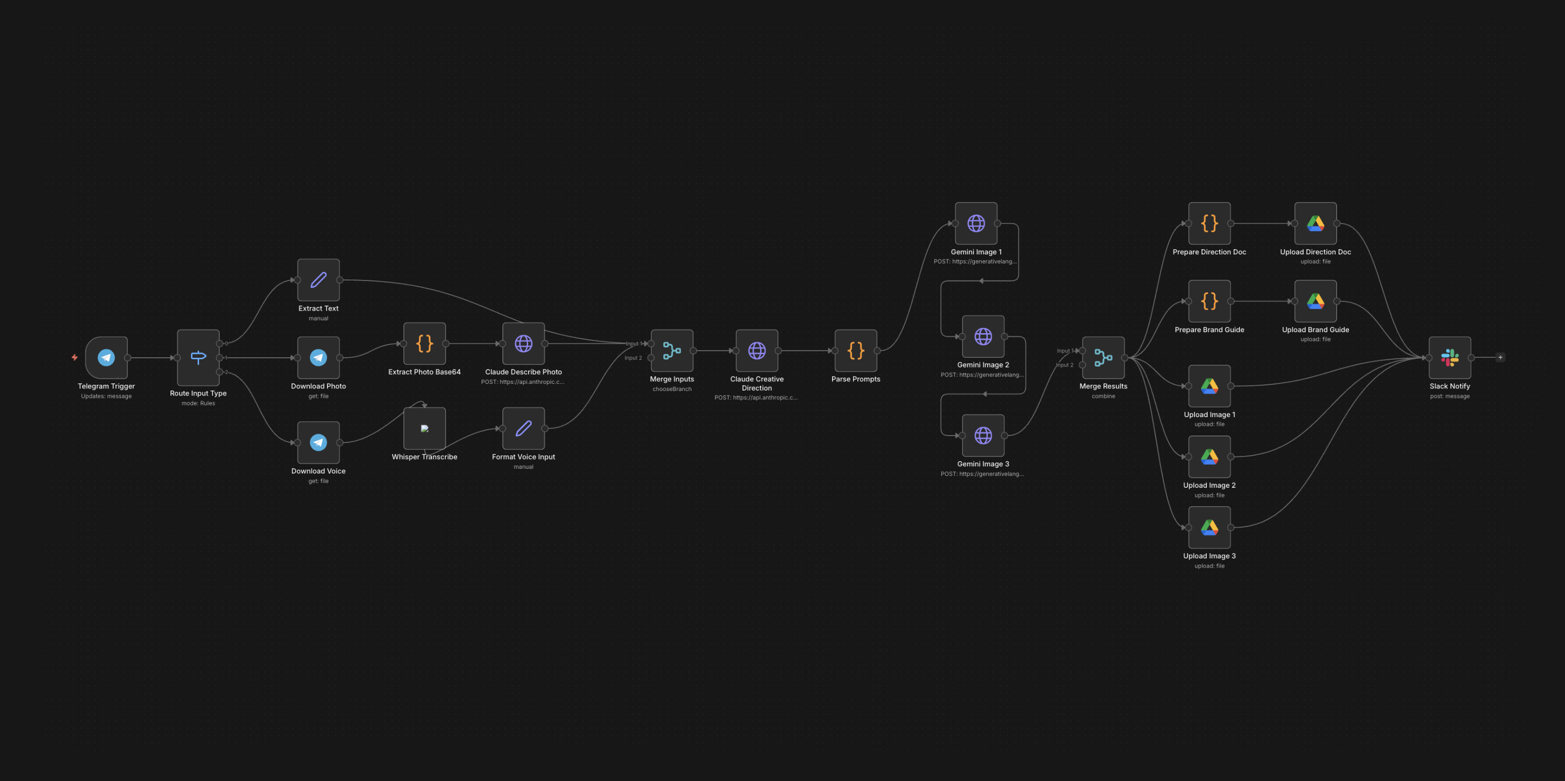 Built a multi-input creative ideation engine for Studio Bubull, a creative studio that needed a faster way to capture raw inspiration and transform it into structured creative direction. The system accepts three input types: a photo, a voice note, or typed text, sent directly from a phone via Telegram. From a single moment of inspiration, the pipeline generates a complete creative package including a creative direction brief, a brand style guide, and three AI-generated mood board images, all delivered to Google Drive with a Slack notification to the team.