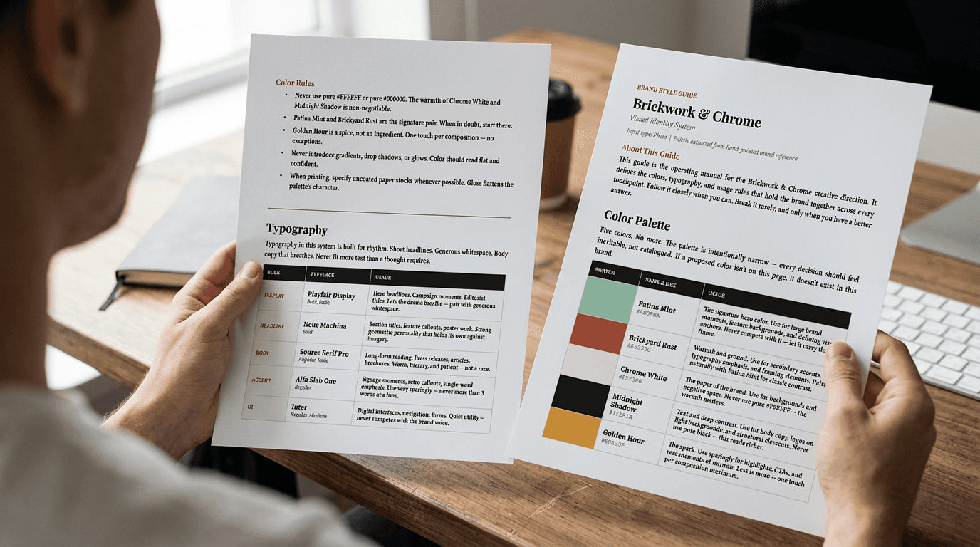 Claude generates a creative brief, brand style guide, and 3 image prompts.